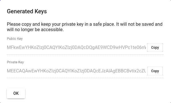 If you selected the "Generate Key" option, then you will be presented with the public and private key pair.