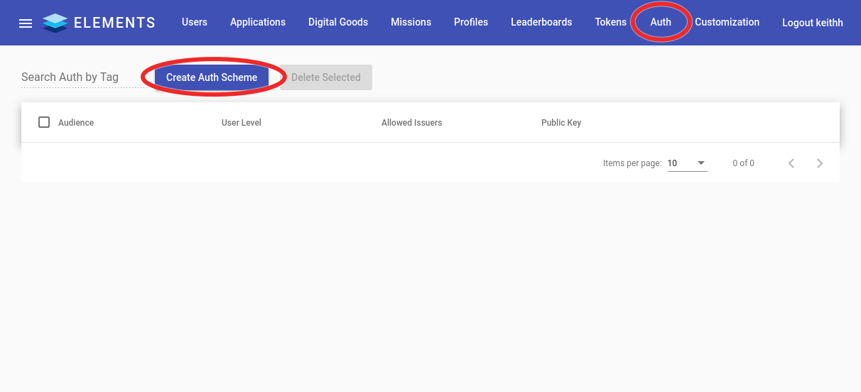 Generating an Auth scheme consists of creating or supplying a public/private key pair and configure the additional metadata in the auth scheme. To begin, open the Elements admin panel and find the section labeled Auth.