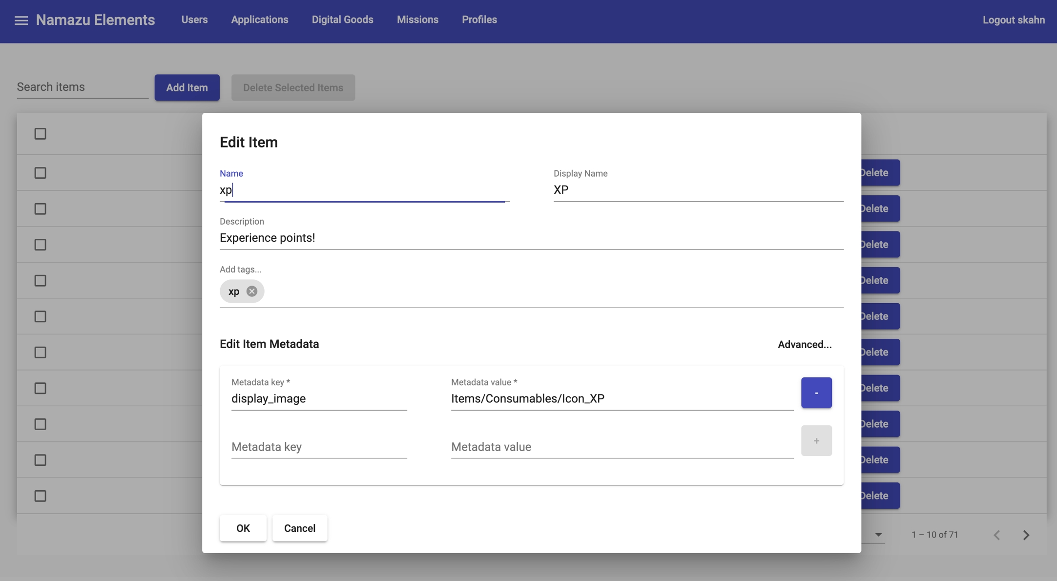 Elements supports traditional Web 2.0 digital goods. Digital goods are items that can be owned by a user in their inventory. User inventories are independent of applications. Examples of digital goods may be consumable items such as potions or gold coins in a video game. Alternatively, they may be part of equipment sets such as swords, helmets, or weapon skins.
