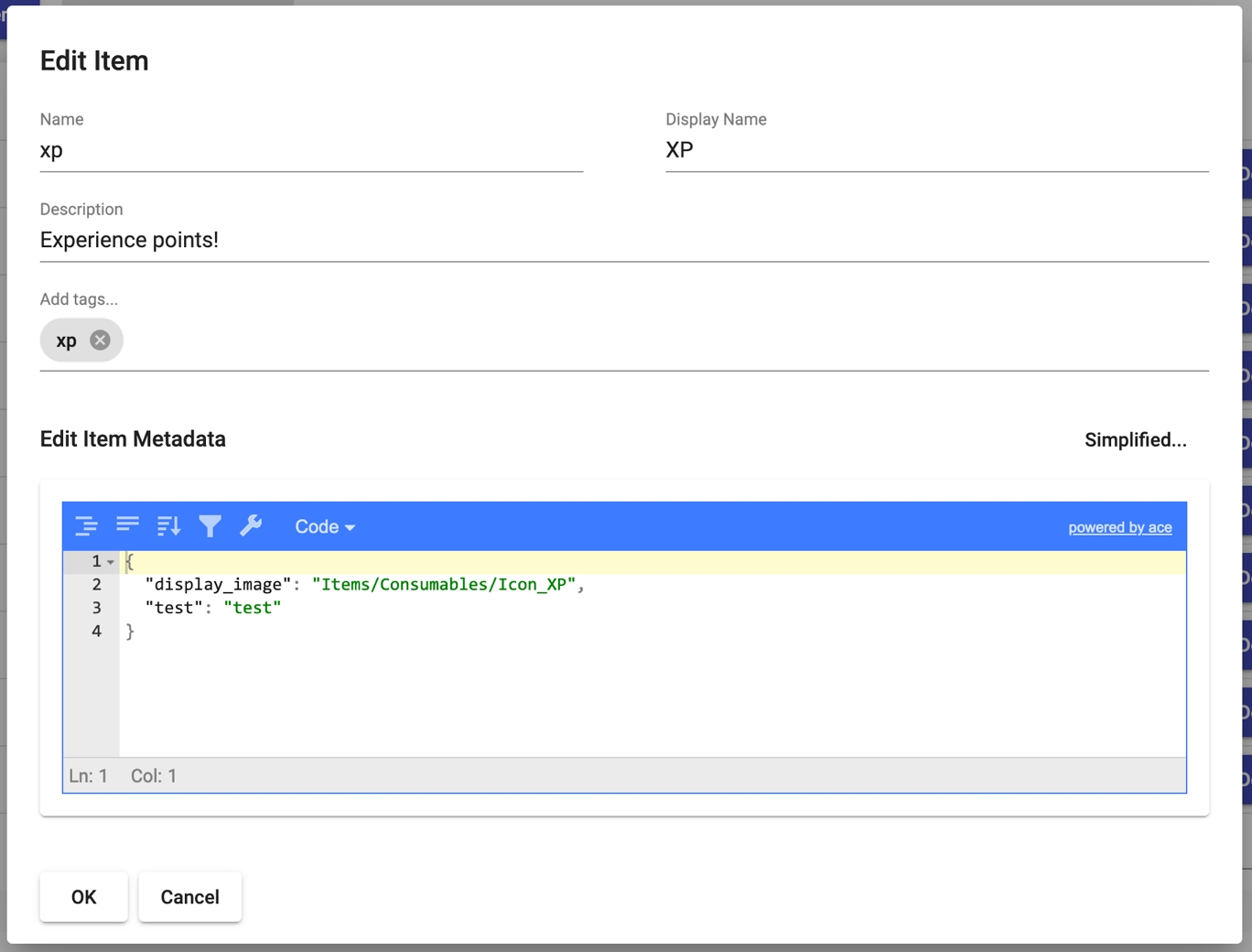 metadata: Metadata is optional. It can be any number of named strings or integers. This can have many uses, for example secondary descriptions, asset paths, types, or any arbitrary values assigned to your item.