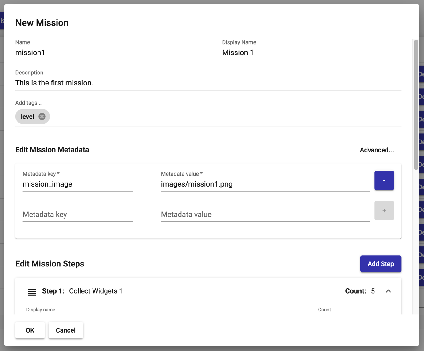 metadata: Metadata is optional. Steps can have their own metadata separate from the overarching mission. It can be any number of named strings or integers. Metadata can have many uses. For example, secondary descriptions, asset paths, types, or any arbitrary values assigned to your mission step.