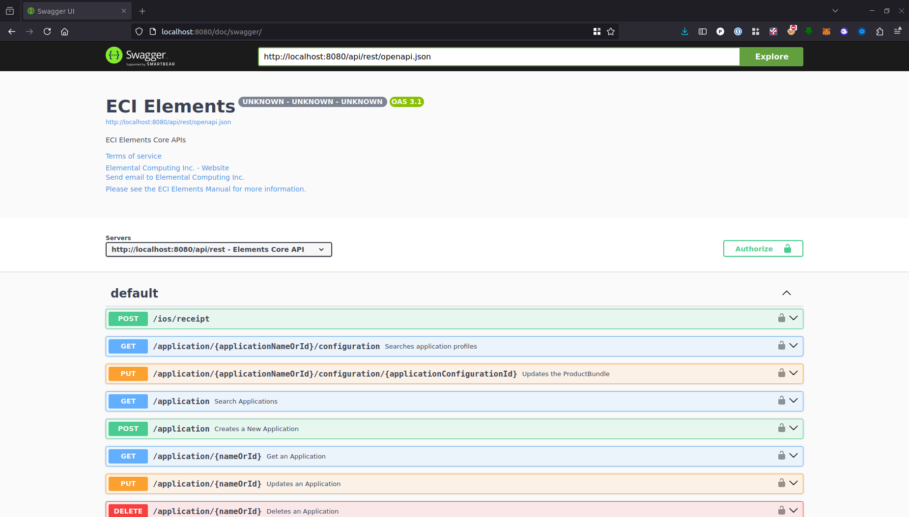 For the Elements Core APIs, enter <http://localhost:8080/api/rest/openapi.json> into the explore bar.